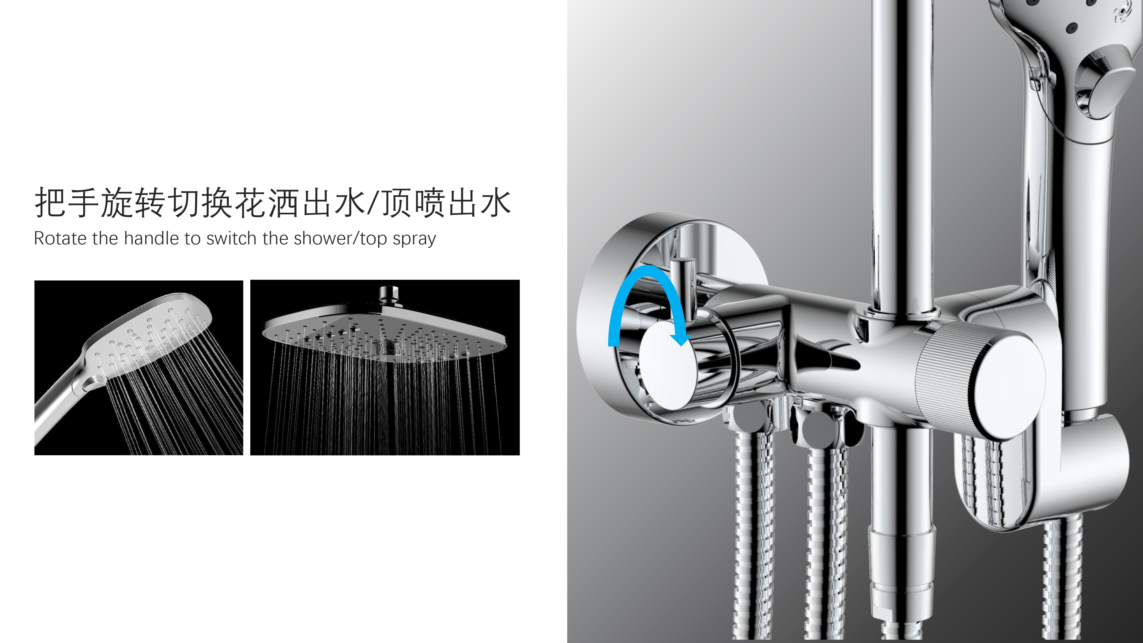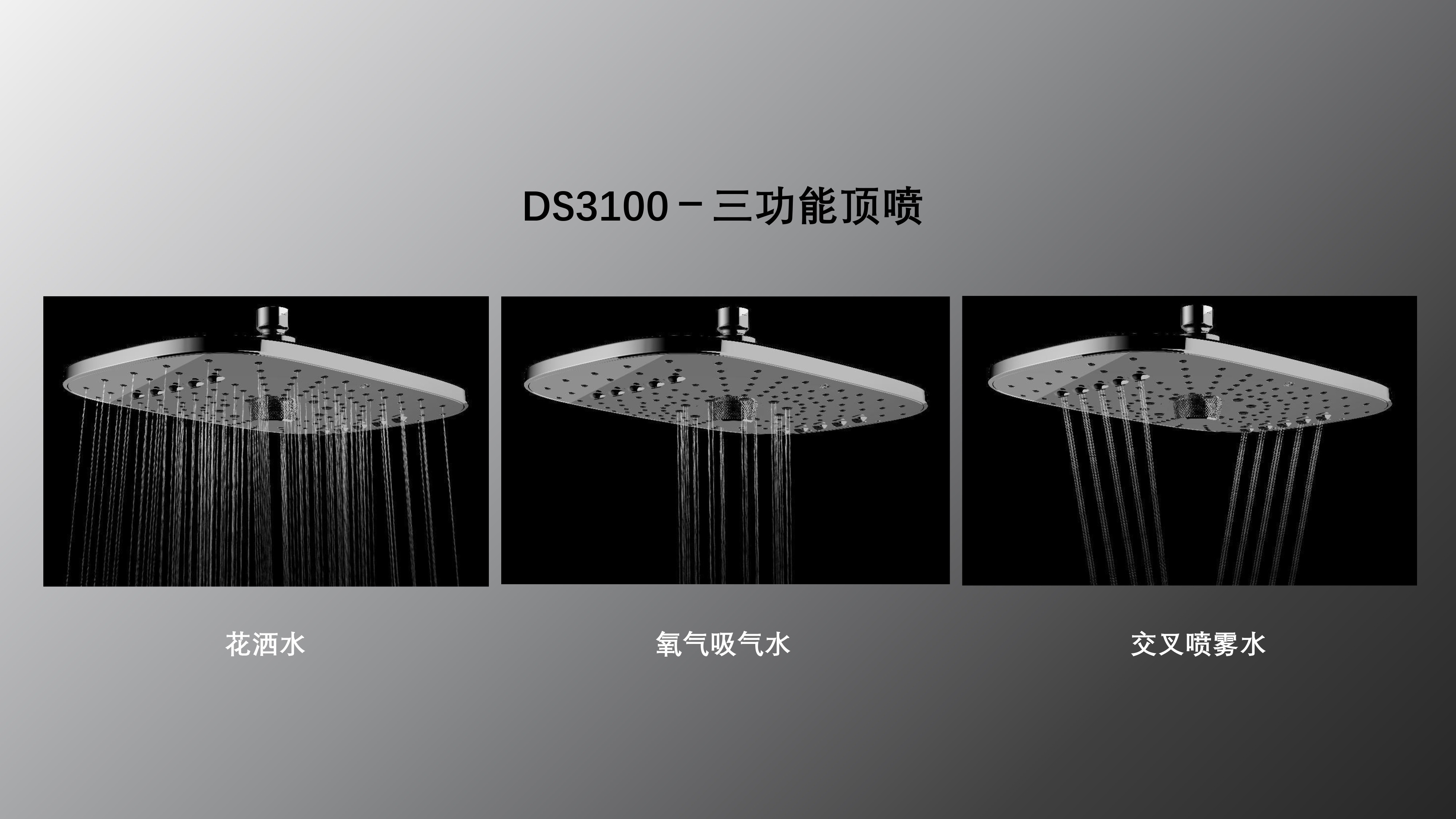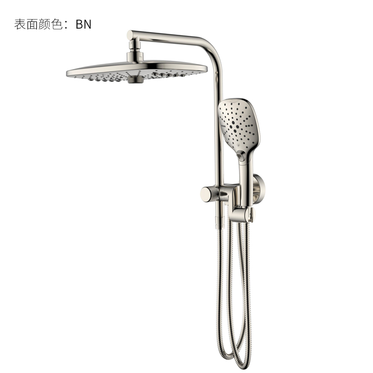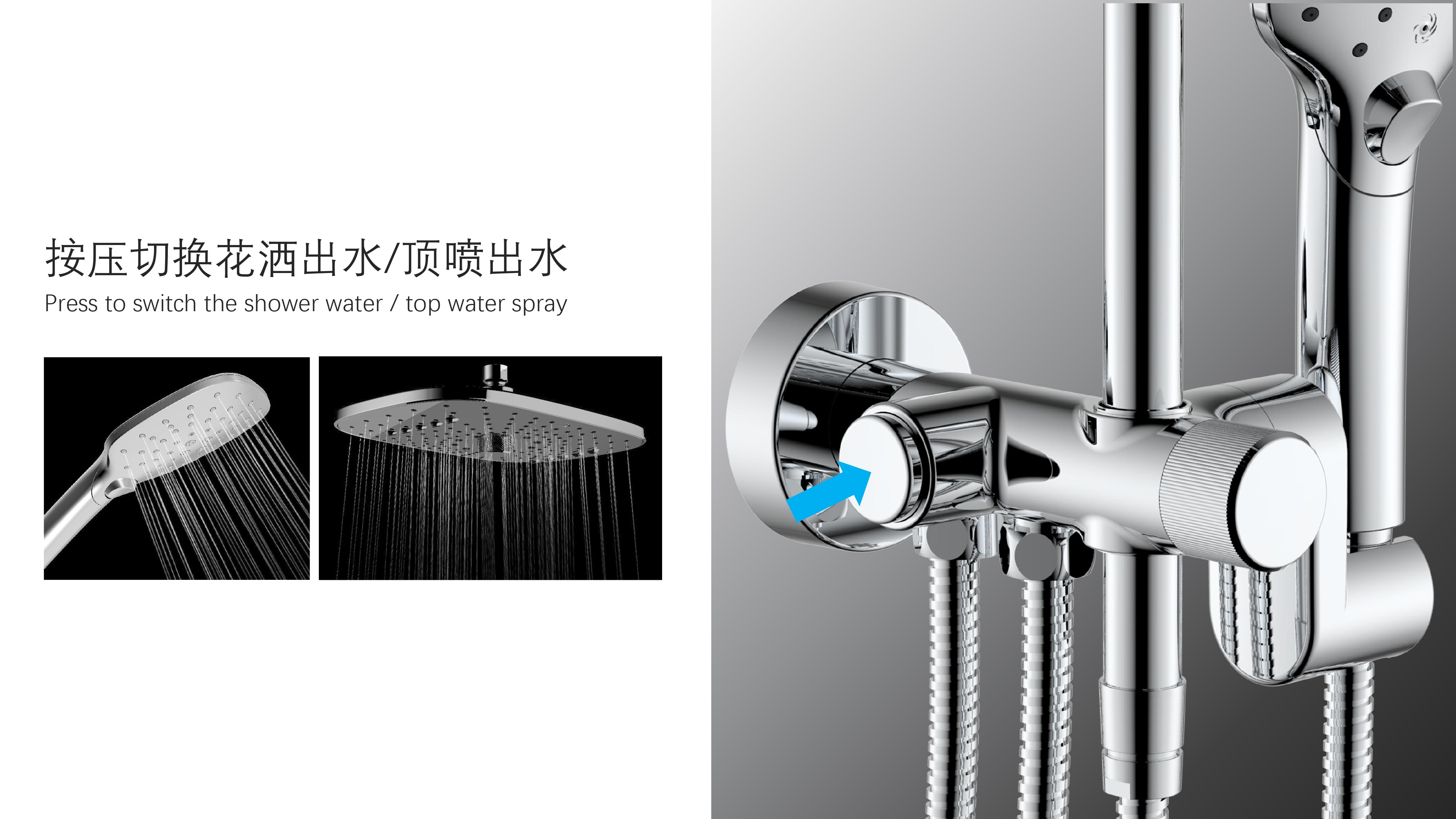 方形寬大頂噴富氧出水;Z字形三通;按壓切換花灑出水/頂噴出水