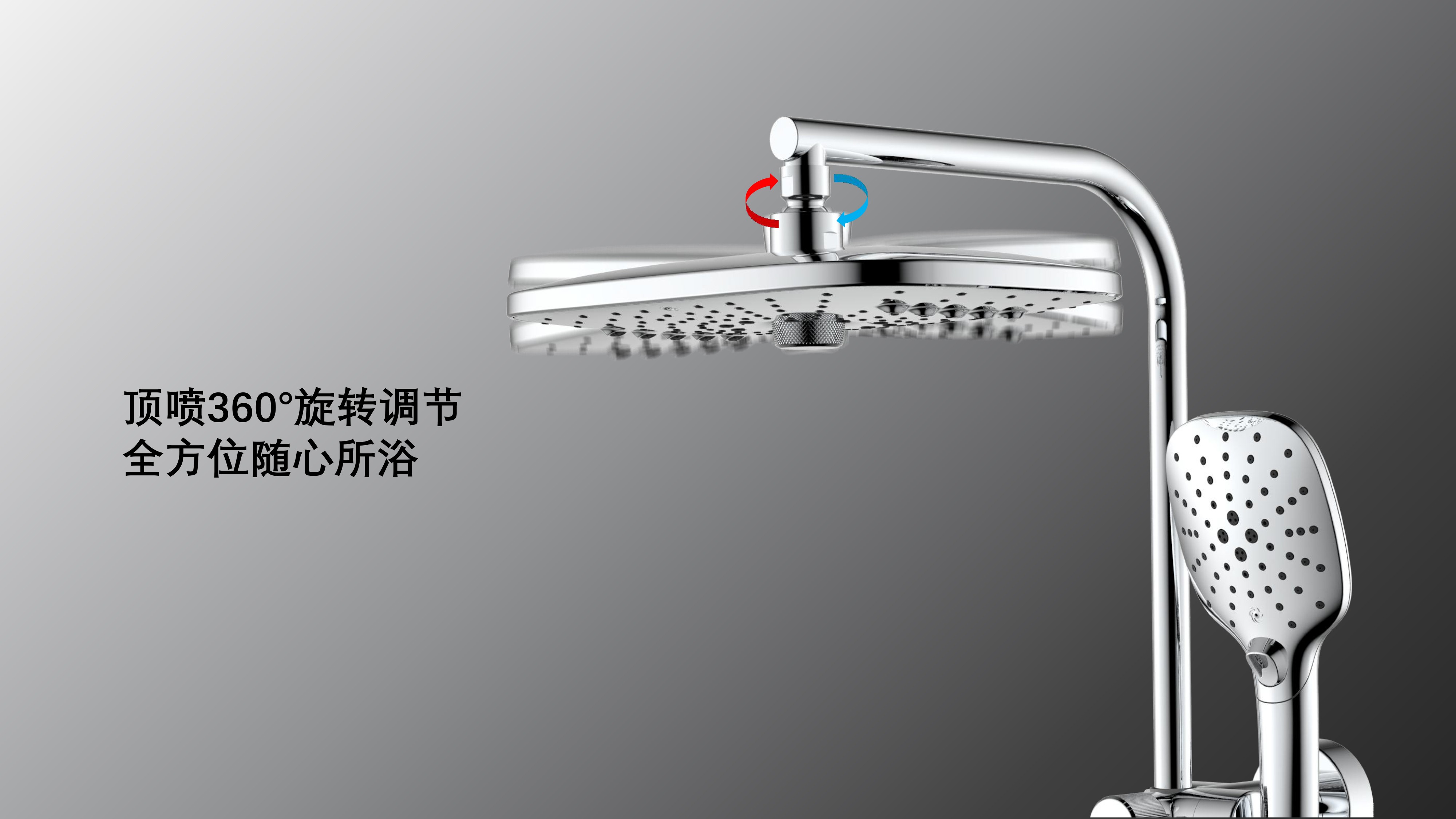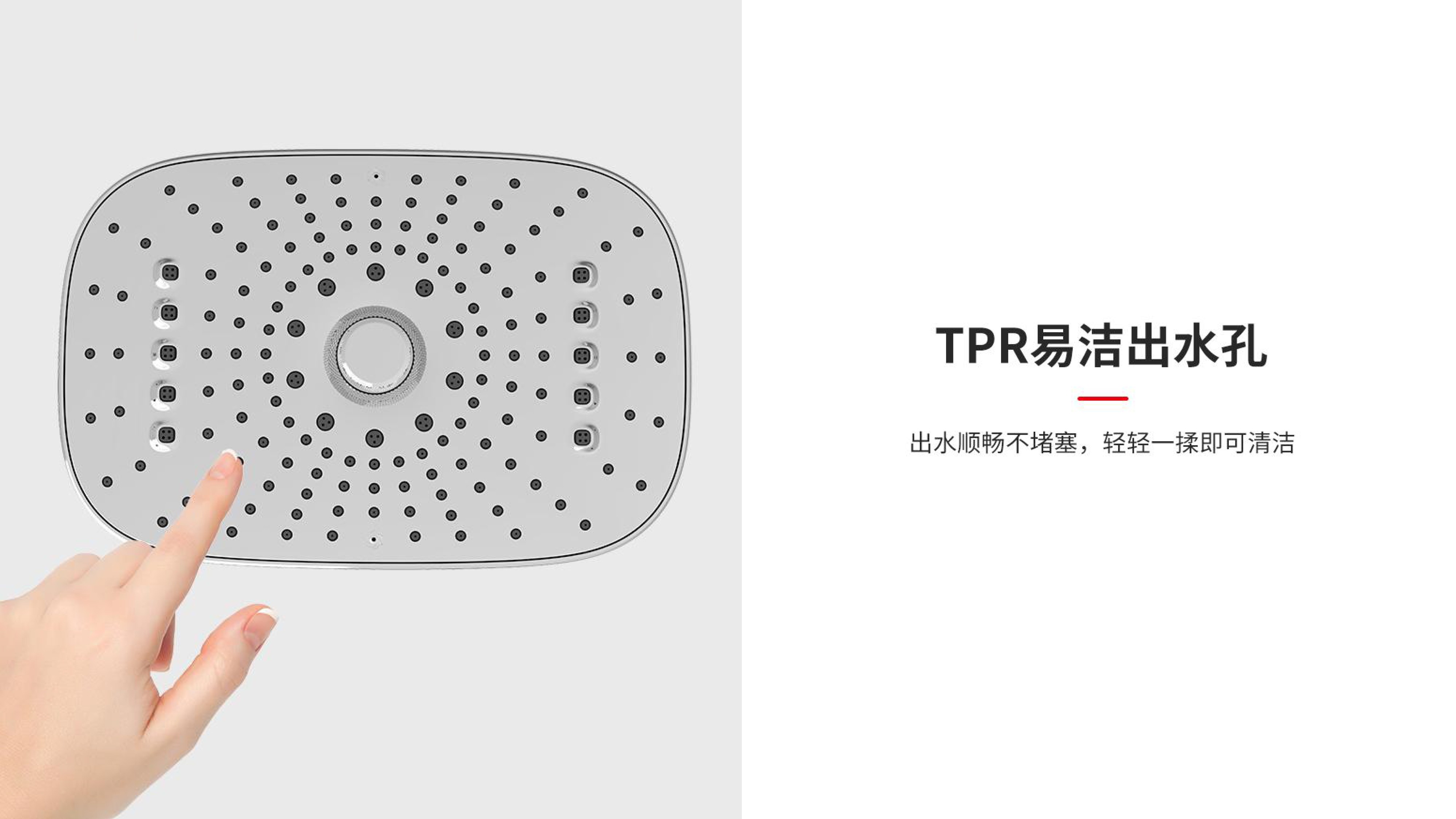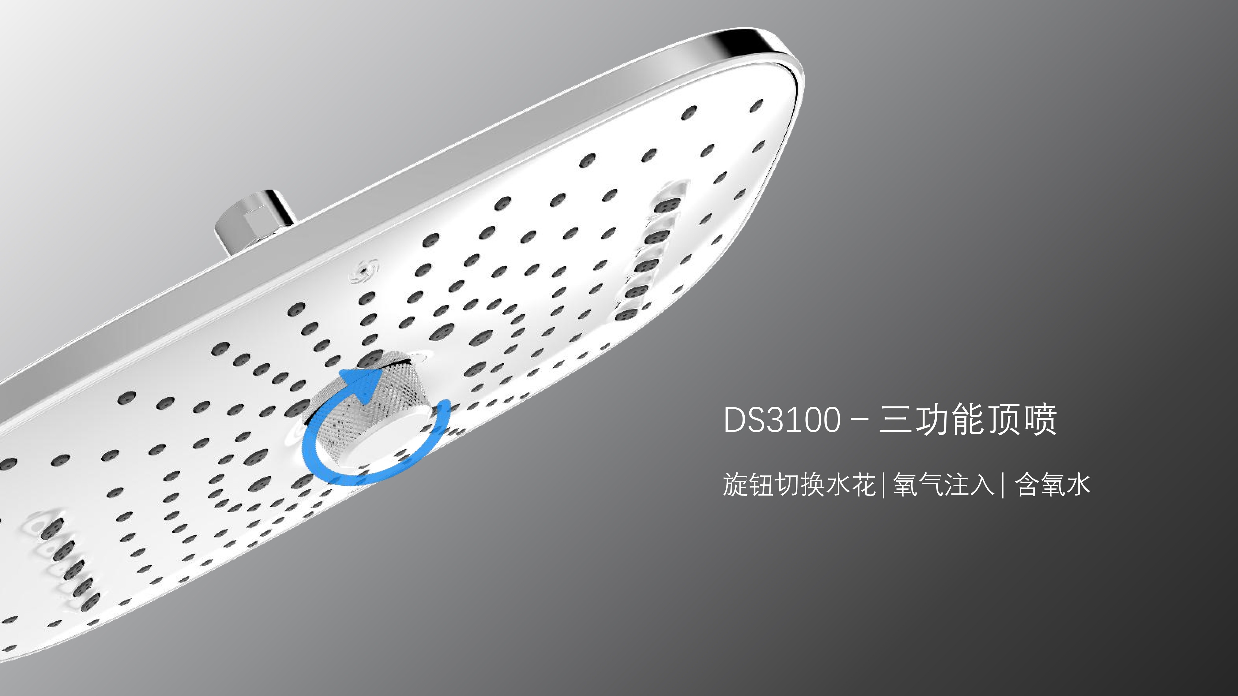 方形寬大頂噴富氧出水;Z字形三通;按壓切換花灑出水/頂噴出水